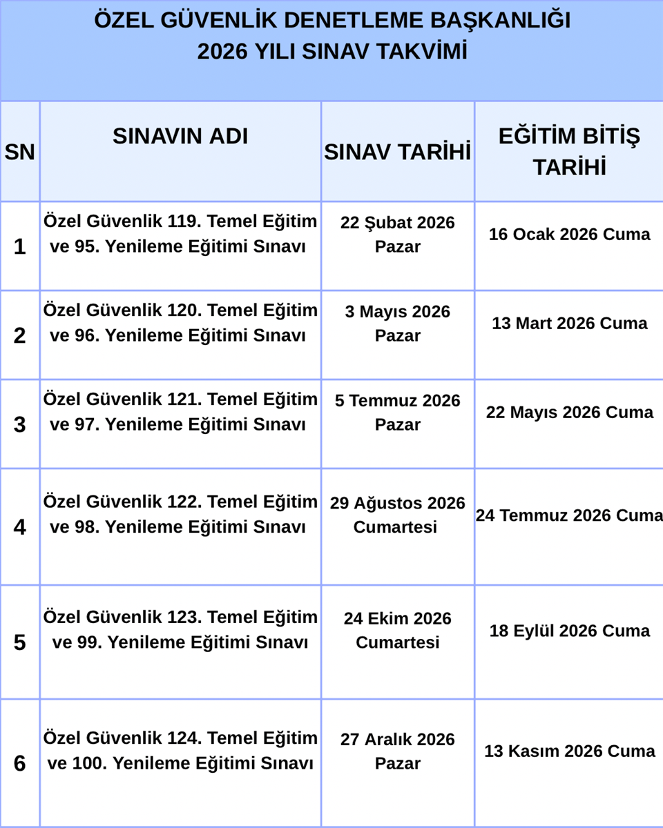 2026 YILI ÖZEL GÜVENLİK SINAV TAKVİMİ